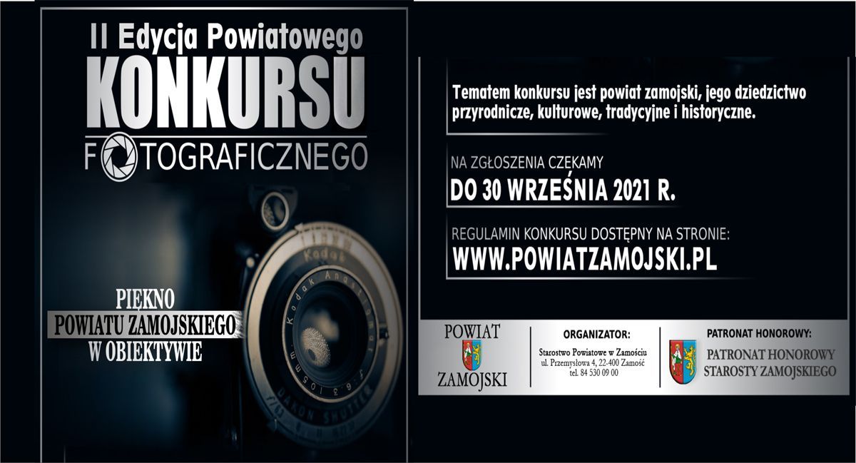 Trwa II Edycja Powiatowego Konkursu Fotograficznego pn.: Piękno Powiatu Zamojskiego w obiektywie”podHonorowym Patronatem Starosty Zamojskiego.****Konkurs ma charakter otwarty, może brać w nim udział każda zainteresowana osoba, która profesjonalnie lub amatorsko zajmuje się fotografią i jest mieszkańcem powiatu zamojskiego.**Zdjęcia na konkurs można zgłaszać do dnia 30 września 2021 roku.
