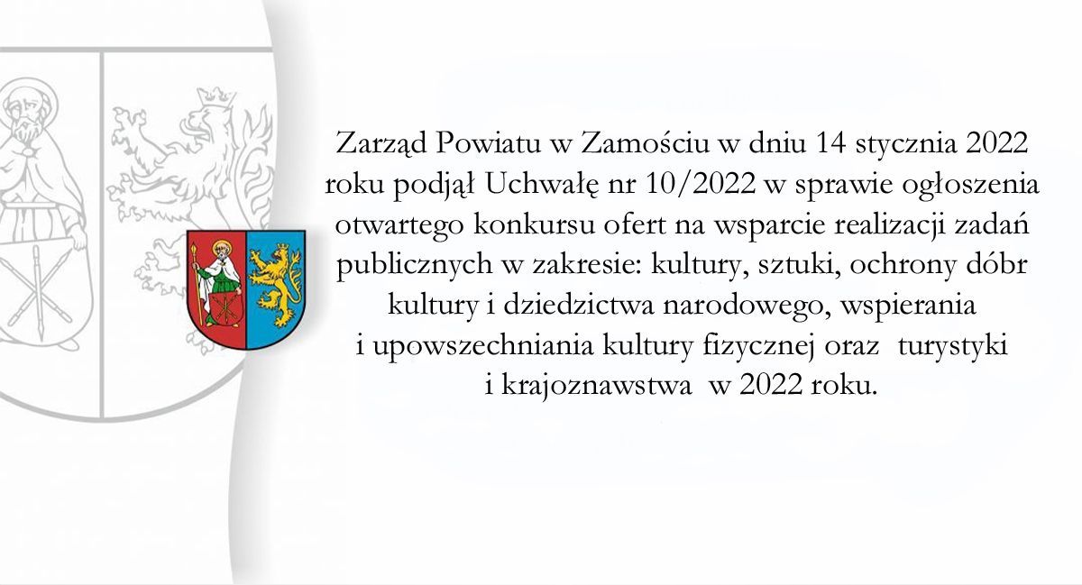 Zarząd Powiatu w Zamościu w dniu 14 stycznia 2022 roku podjął Uchwałę nr 10/2022 w sprawie ogłoszenia otwartego konkursu ofert na wsparcie realizacji zadań publicznych w zakresie: kultury, sztuki, ochrony dóbr kultury i dziedzictwa narodowego, wspierania i upowszechniania kultury fizycznej oraz turystyki i krajoznawstwa w 2022 roku.