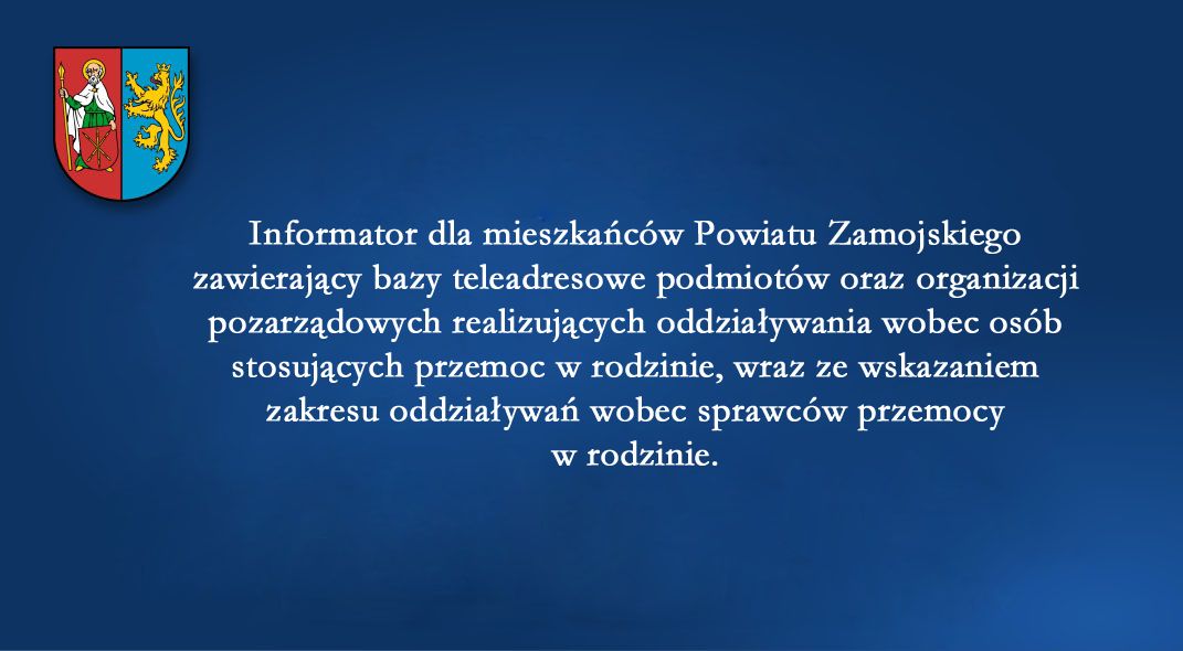 Informator dla mieszkańców Powiatu Zamojskiego zawierający bazy teleadresowe podmiotów oraz organizacji pozarządowych realizujących oddziaływania wobec osób stosujących przemoc w rodzinie, wraz ze wskazaniem zakresu oddziaływań wobec sprawców przemocy w rodzinie.