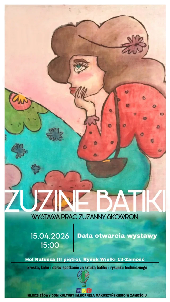 W Zamościu szykuje się spotkanie z pracami młodej twórczyni, które ma w sobie i lekkość koloru, i porządek linii. Młodzieżowy Dom Kultury im. Kornela Makuszyńskiego otwiera wystawę Zuzanny Skowron, uczennicy zajęć batiku wielobarwnego, a całość trafi do bardzo reprezentacyjnego miejsca w samym sercu miasta.
