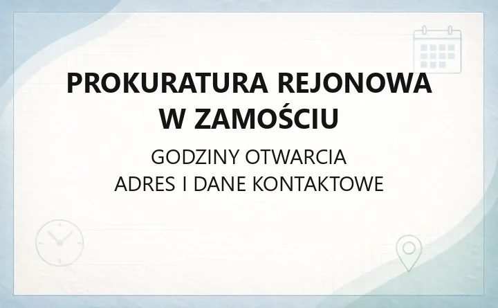 Prokuratura Rejonowa w Zamościu działa przy ul. Szczebrzeska 47, 22-400 Zamość. Urząd pracuje od poniedziałku do piątku w godzinach 07:30–15:30. To tu mieszkańcy Zamościa i okolicznych gmin załatwiają sprawy związane m.in. ze składaniem zawiadomień o przestępstwie oraz udziałem prokuratora w postępowaniach sądowych.